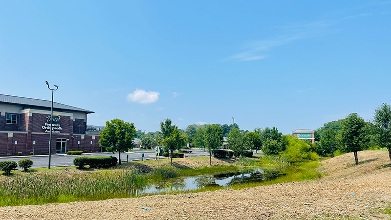 The strategy focused on selective land clearing of excessive vegetation while preserving the pond’s stormwater function and structural integrity.