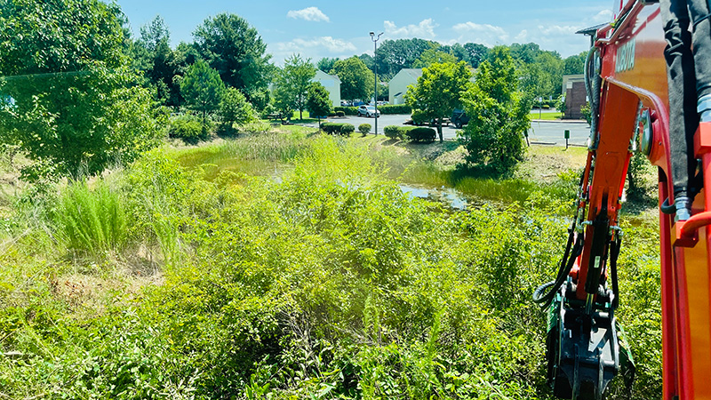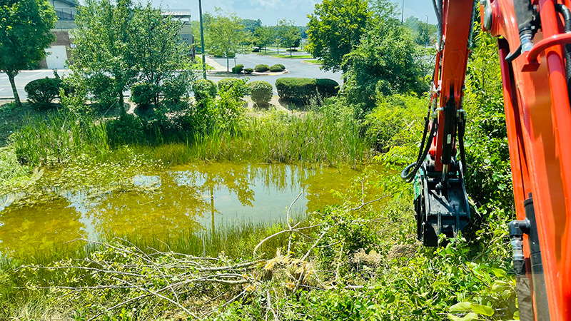 The commercial retention pond had become severely overgrown, with unmanaged scrub brush and trees encroaching on the pond banks.